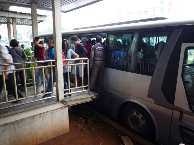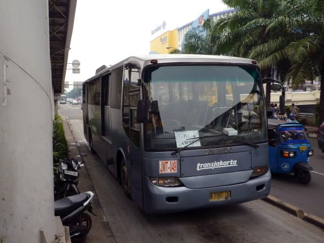 The system operates just like most mass-rapid transit systems in other countries, there are dedicated stations (that act as the bus-stops) that require you to buy a ticket to enter. Whilst the medium of transport is via bus, the method of transaction and entry into a bus-stop isn’t. You have to buy a ticket to enter the shelter (or bus stop), and not pay upon entry into a bus (or tap a contactless smart card for transaction). TransJakarta “halte” (bus tops) or shelters are different from ordinary bus stops. They are typically located in the median (not side) of the road and are only reached by elevated bridges. Buses run from 5AM to 10PM daily. Ticket prices are heavily are subsidized by the state government and cost a mere 2,000 rp (S$0.29) before 7 AM, and 3,500rp (S$0.51) thereafter. Tickets are single-trip, single-entry regardless of distance. You pay the same even if you travel three stops, or if you travel from one end of the corridor to another. Passengers who change direction or move to another corridor will not need to pay again as long as they do not exit the shelter. The routes are known as “corridors”, unlike buses that ply a more inaccessible area of the city or side-roads in towns, the design of the busway route is similar to that of a Mass Rapid Transit system, routes can only run parallel to major roads and are linearly straight; shelters are rarely skipped even where no one alights or embarks. TransJakarta currently has 10 corridors (or lines) in operation and are very similar to a mass-rapid transit system of any country in linearity, transfer and operations, it’s similar to Singapore’s SMRT’s four existing lines (NEL, EW, NS and Circle lines). Corridor 1: Terminal Blok M – Kota (City) Corridor 2: Pulogadung - Harmoni Corridor 3: Kalideres - Pasar Baru Corridor 4: Pulogadung - Dukuh Atas Corridor 5: Kampung Melayu - Ancol Corridor 6: Ragunan - Latuharhari Corridor 7: Kampung Rambutan - Kampung Melayu Corridor 8: Lebak Bulus - Harmoni Corridor 9: Pinang Ranti - Pluit Corridor 10: Cililitan - Tanjung Priok If you have an iPhone or iPod touch, a Transjakarta Application map is also available to download, http://www.equinoxapps.com/apps/transjakarta/ for $1.99 http://www.rutebusway.com/ Unlike Jakarta's other buses, TransJakarta shuttle on fully dedicated lanes and passengers must use dedicated stations with “automatic” doors (most don’t work), the doors of the shelter will slide and open automatically whenever a bus arrives. The shelters are usually found in the middle of large thoroughfares connected to both sides by overhead bridges. The passenger doors are placed higher than normal so that passengers can only board from the designated shelter. To enter a shelter, you have to first buy a paper ticket from the counter manned by a TransJakarta staff, and then get that very piece of paper “torn” to imply entry. Tickets are still torn out of an old-fashioned ticket-booklet by a member of the staff, transactions are all made in cash (no Visa or ATM transaction available). There are no machines or slots to automate the process at all, no tap-and-go contact cards. There was an attempt several years ago to introduce a “multi-travel pass” or the JAKard, but it didn’t work and the whole system was cancelled. The old-fashioned turnstile barriers do not work at almost all the bus-stops; those that do work have had their armatures removed to facilitate access. The bus is very crowded during rush hours. You experience on TransJakarta will vary depending on the time and day that you get on the bus, I have been fortunate enough to get on an empty bus that enjoyed the relatively comfortable ride (seats and air-conditioning), smooth non-jarring and relatively speedy journey (dedicated lanes), and at the other extreme end of the spectrum, the buses can get EXTREMELY crowded, especially during rush hours at 7AM and 4PM and whilst people are gracious, the environment doesn’t support graciousness. I’ve been jostled, elbowed, pushed, yanked, trodden on, pressed on, pulled and what not. When the bus arrives, you will be forced forward by the force of the mass of people surging forward, there is no personal space and you have to be extremely careful with your belongings. The mass of commuters will jostle and push their way through to the entrance of the bus. Grab onto a handle as soon as you enter the bus as they move away from the stop suddenly and quickly. It is not advisable to carry bulky or large items up TransJakarta due to the extreme congestion and shaky somewhat tumulus rides that require your complete attention and strength to keep yourself standing upright, Of all the interchanges in the whole system, Harmoni Central Interchange, this central hub is the busiest interchange and is a sole transfer point for 6 corridors, whilst this enlarged shelter has a capacity of 500 people and 6 access doors, just imagine rush-hour mass of commuters passing through this one central station, which can be several hundred thousand souls in a day. As a result, Harmoni is the craziest, busiest, most bustling mass of commuters trying very hard to get to wherever they are trying to get to, it’s a constant challenge to stand still to actually look at the system map and to determine where you want to go to because people are jostling at you from all directions. ![]() Rare interior view (don't ask me how I managed to take this picture). ![]() Normal non-rush hours. ![]() Typical bus ![]() Notice the elevated platform for passengers to align or embark from the designated bus-stop only. ![]() ![]() The system is remarkably user-friendly by Jakartan standards, and there are visible attempts at improving the entire system since its first inception in January 2004, since then more routes and bus-stops have been added to the 10 corridors today, with newer stations having announcements, an attempt to install the “bus arrival system” at Harmoni Central and an LED displays a